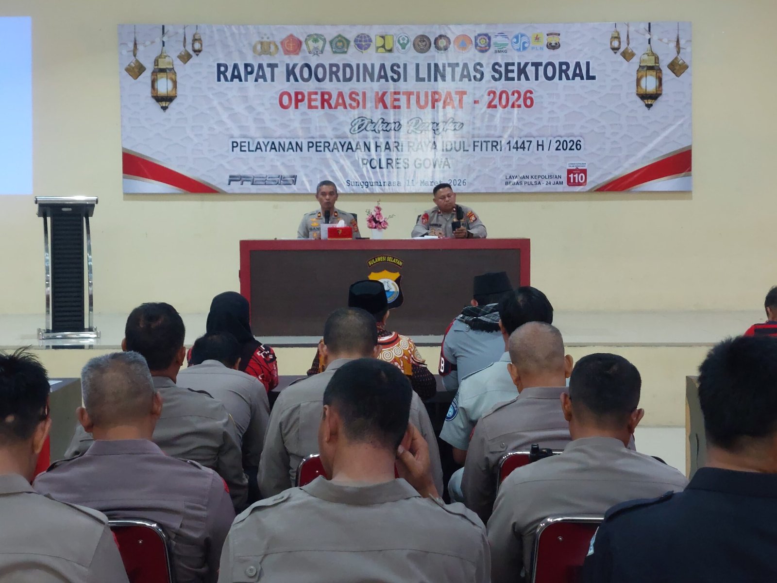 GOWA | Polres Gowa menggelar Rapat Koordinasi Lintas Sektoral Operasi Ketupat 2026 dalam rangka kesiapan pengamanan dan pelayanan perayaan Hari Raya Idul Fitri 1447 H/2026 M. Kegiatan tersebut berlangsung di Aula Rewako Polres Gowa, Kamis (12/3/2026).