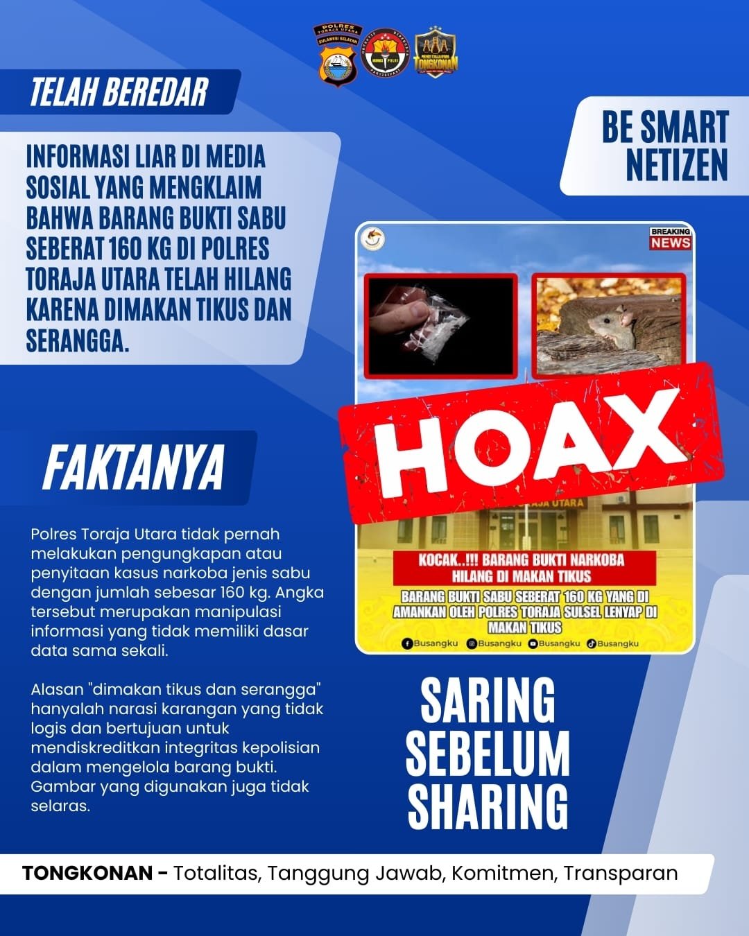 Saat dikonfirmasi Rabu (11/03/2026), Kapolres Toraja Utara AKBP Stephanus Luckyto A.W, S.I.K., S.H., M.Si, menungkapkan bahwa informasi yang belakangan ini beredar di media sosial terkait barang bukti sabu seberat 160 kilogram yang dimankan Polres Toraja Utara hilang karena dimakan tikus dan serangga itu adalah hoaks atau berita bohong.