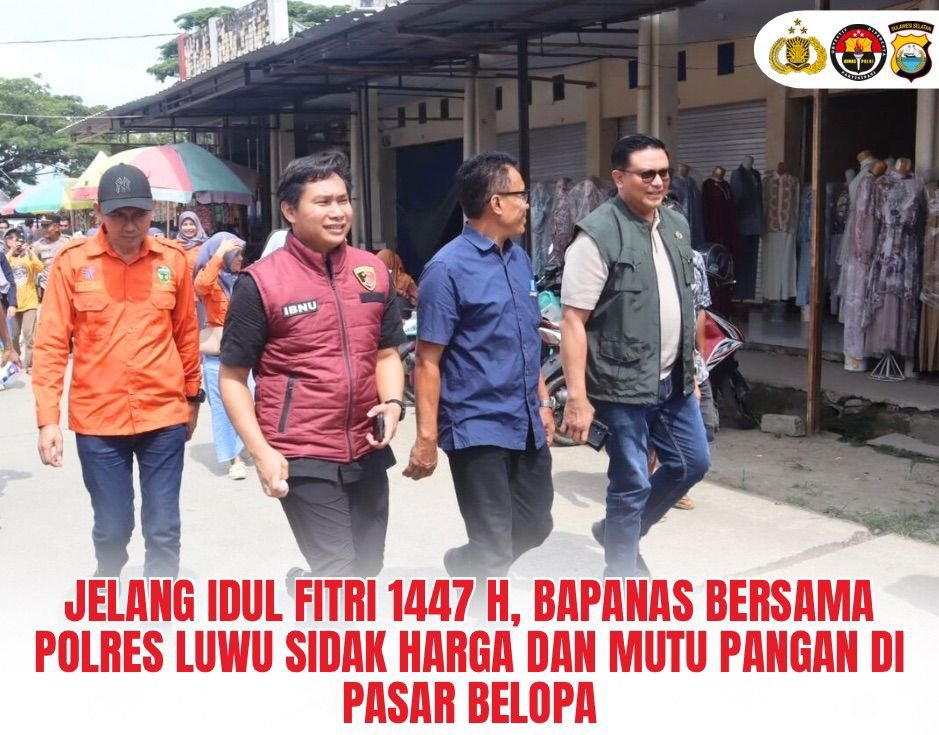 Luwu, Garbileka.my.id – Menjelang Hari Raya Idul Fitri 1447 Hijriah, Badan Pangan Nasional (Bapanas) RI bersama Satgas Pangan Kab. Luwu melaksanakan kegiatan pengawasan harga, keamanan, dan mutu pangan di Pasar Sentral Belopa, Kabupaten Luwu, Minggu (15/3/2026).