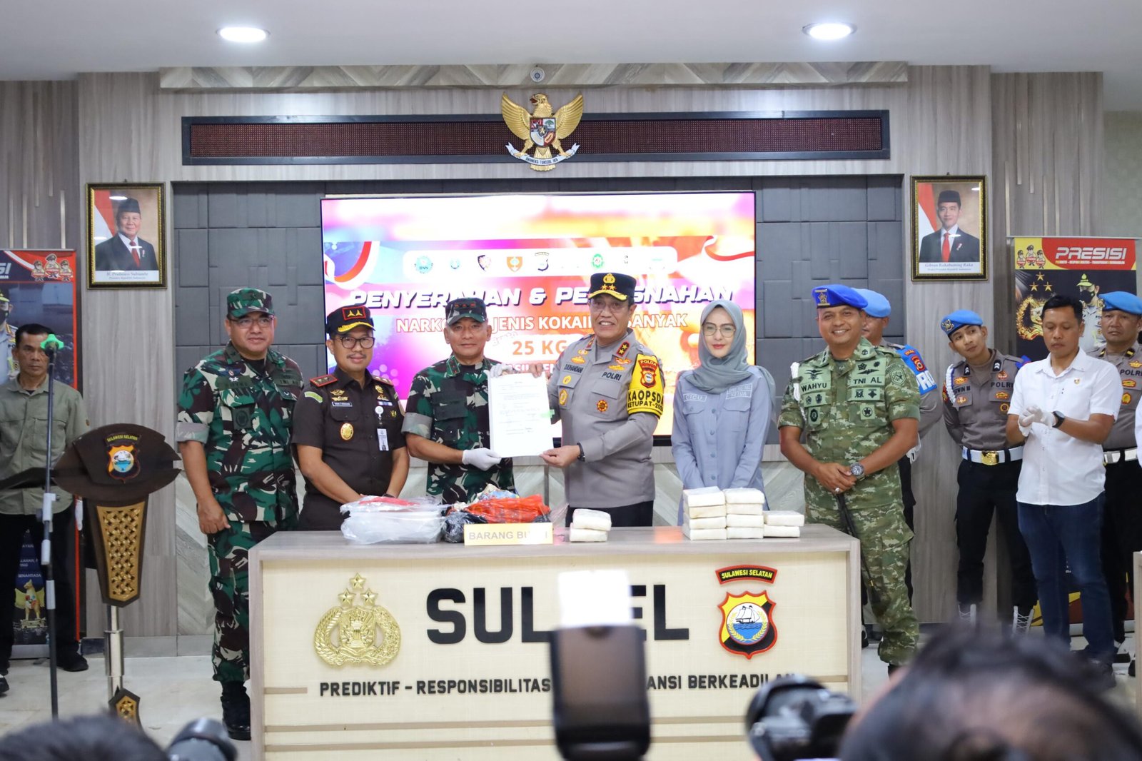 “Hari ini merupakan bukti nyata bahwa sinergitas TNI, Polri dan seluruh stakeholder yang ada di Sulawesi Selatan bukan sekadar slogan. Penyerahan barang bukti kokain hasil temuan di wilayah Kepulauan Selayar kepada Polres Selayar yang hari ini ditindaklanjuti secara resmi menunjukkan koordinasi yang sangat solid di lapangan,” ungkap Kapolda.